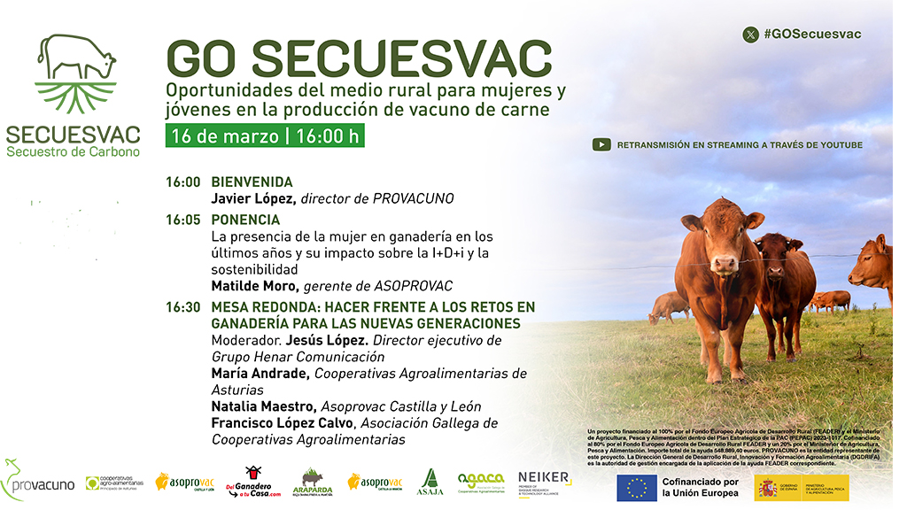 El Grupo Operativo SECUESVAC celebrará el próximo lunes 16 de marzo, de 16:00 a 17:00 horas, un webinar titulado “Oportunidades del medio rural para mujeres y jóvenes en la producción de vacuno de carne”, que se retransmitirá en streaming a través de YouTube. El encuentro pondrá el foco en el papel clave que mujeres y jóvenes desempeñan en el relevo generacional, la modernización del sector y el impulso de modelos productivos más sostenibles.