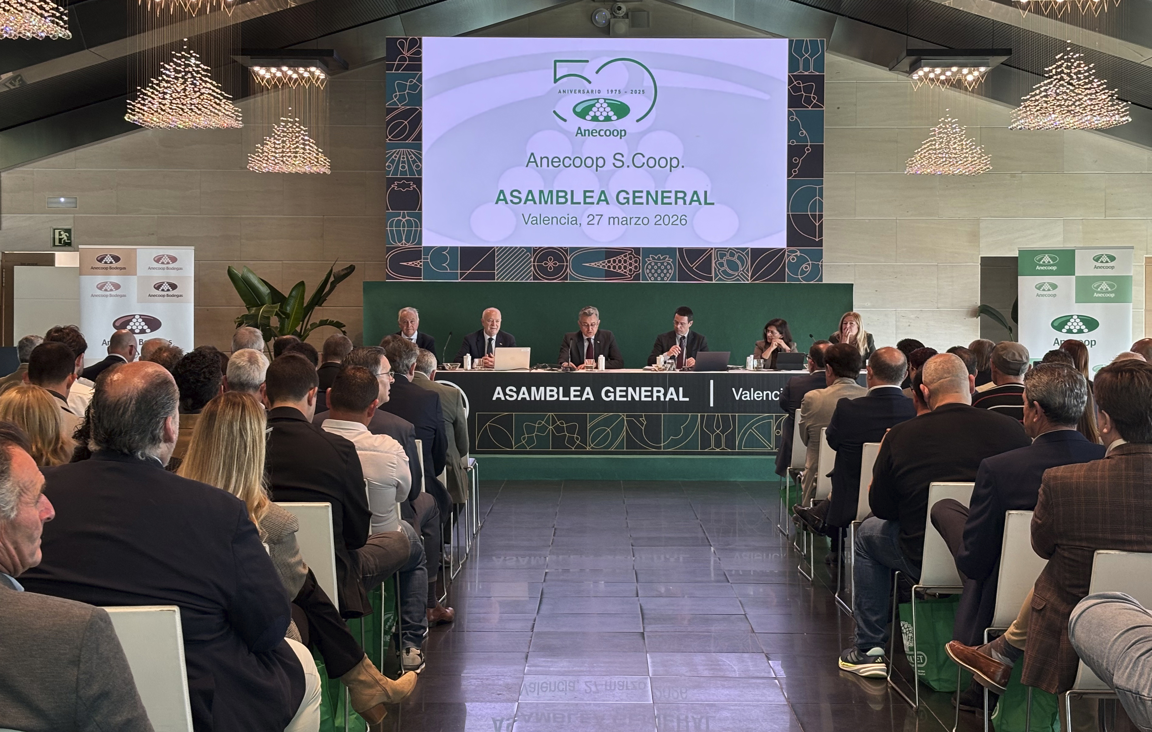 Inmersa en la celebración de su 50 Aniversario, Anecoop, cooperativa agroalimentaria española líder en la comercialización de frutas y hortalizas, ha celebrado esta mañana su Asamblea General en el Hotel Las Arenas, de Valencia. Su presidente, Alejandro Monzón, y su director general, Joan Mir, han presentado la Memoria RSC de la entidad en la que se recogen los resultados del ejercicio 2024-2025 ante los más de 250 socios y profesionales del Grupo que han asistido a esta convocatoria.