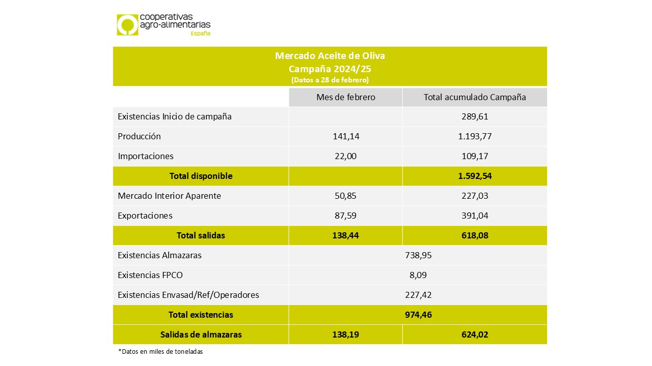 Por lo que respecta a las salidas de aceite de almazara, se sitúan en 138.189,21 t. El total de salidas acumuladas a 28 de febrero en almazaras es de 624.016,83 t.