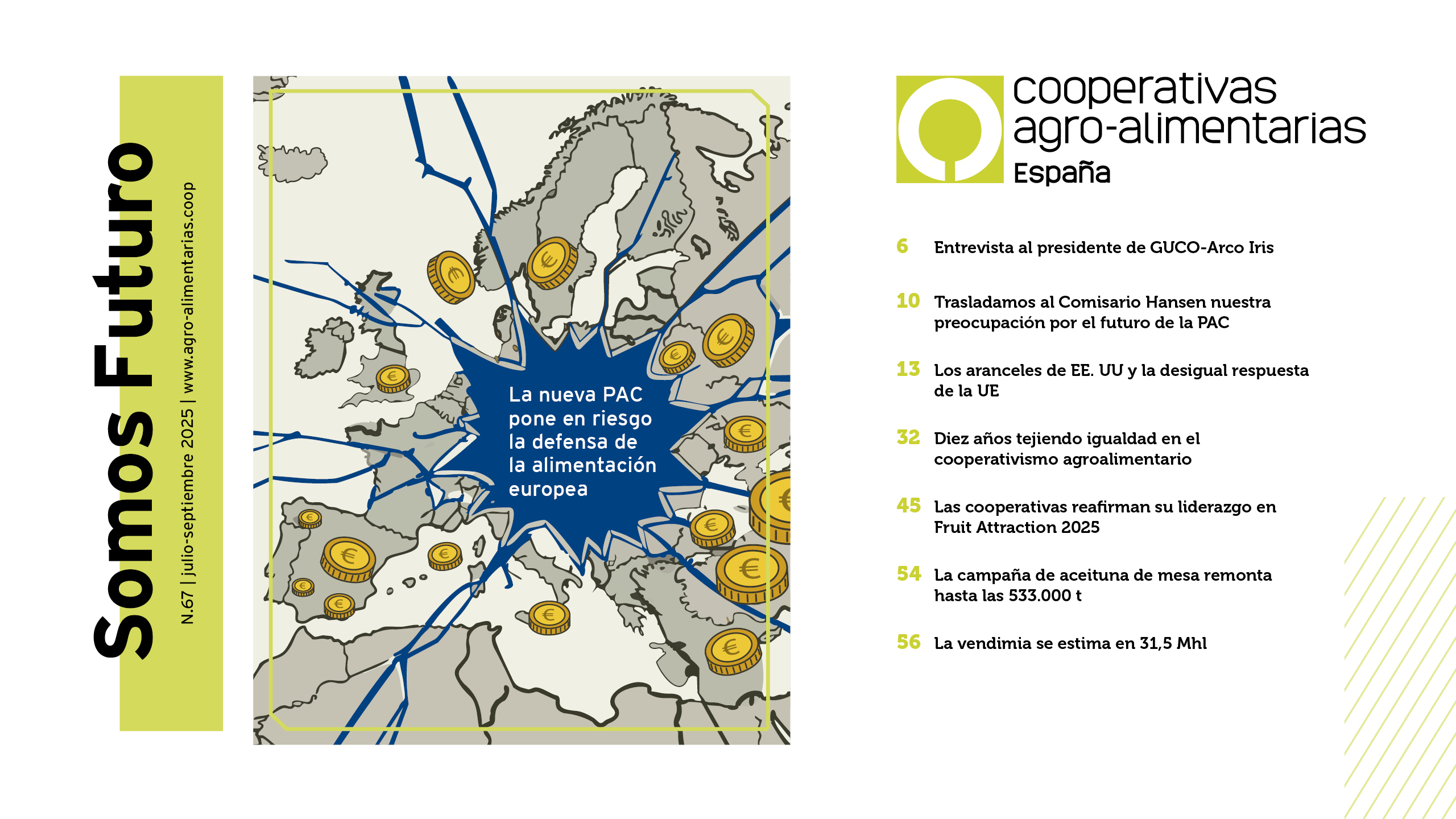 El tercer trimestre de 2025 ha estado marcado por una intensa agenda institucional. Cooperativas Agro-alimentarias de España ha trasladado a las instituciones europeas y españolas su preocupación por el futuro de la Política Agraria Común (PAC). En este número analizamos los principales aspectos de la propuesta de reforma del Marco Financiero Plurianual y de la PAC, así como las implicaciones de los acuerdos comerciales con EE. UU y Mercosur. En sectores, recogemos la destacada participación de nuestras cooperativas en Fruit Attraction 2025, los datos de la campaña de aceituna de mesa y la última estimación de vendimia. Varias entrevistas y artículos de opinión analizan temas de actualidad, en un momento clave para el sector.
