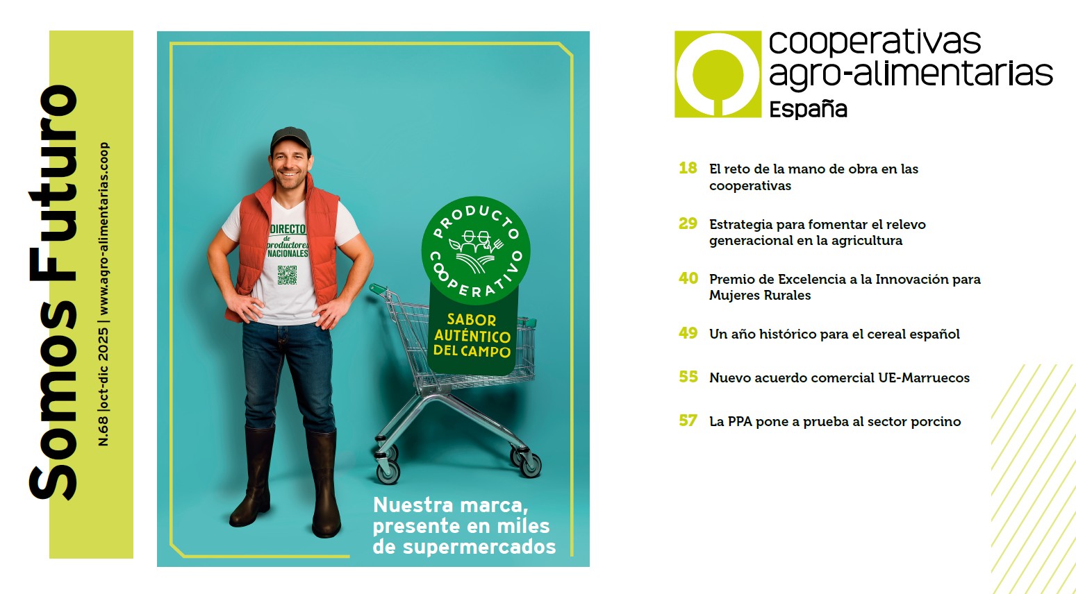 Este número de nuestra revista destaca la expansión de la marca ‘Producto Cooperativo’ y el éxito de una estrategia conjunta que gana visibilidad y conquista el lineal. La revista recoge reflexiones de referentes del cooperativismo y una entrevista que subraya el valor de las EAPs para mejorar eficiencia y competitividad. El cooperativismo español también es noticia por sus reconocimientos en innovación en Europa y en España. Además, se abordan retos estratégicos como la mano de obra en las cooperativas y el relevo generacional en la agricultura, así como la actualidad de los principales sectores productivos y de los seguros agrarios.